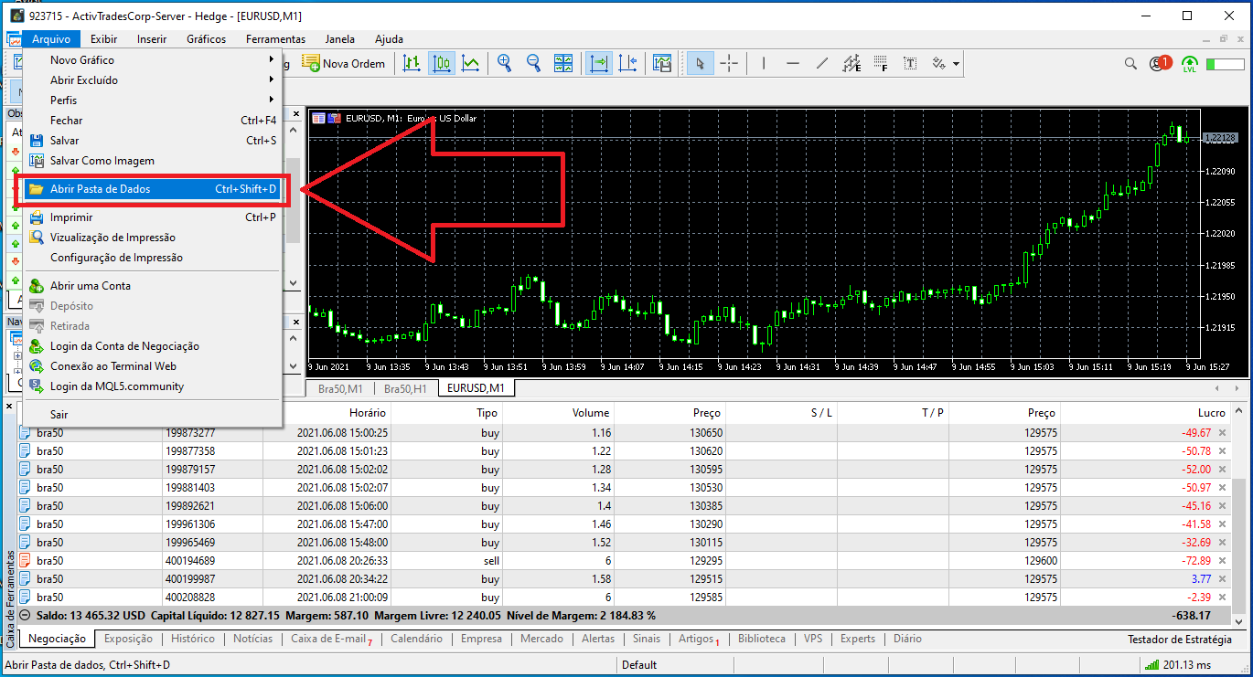 Abra a pasta de dados onde fica instalado o Expert da EAFXTRADE, para isso, clique no menu arquivo e em seguida clique em “Abrir Pasta de Dados”