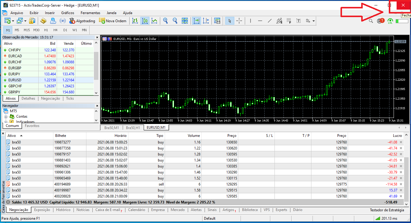 Feche o Metatrader por completo clicando no botão em destaque: