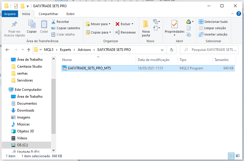 Com o Metatrader Fechado, Pegue a pasta de Dados, clique em MQL5, Clique novamente em Experts\Advisor\EAFXTRADE SETS PRO, e novamente clique em EAFXTRADE_SETS_PRO_MT5.