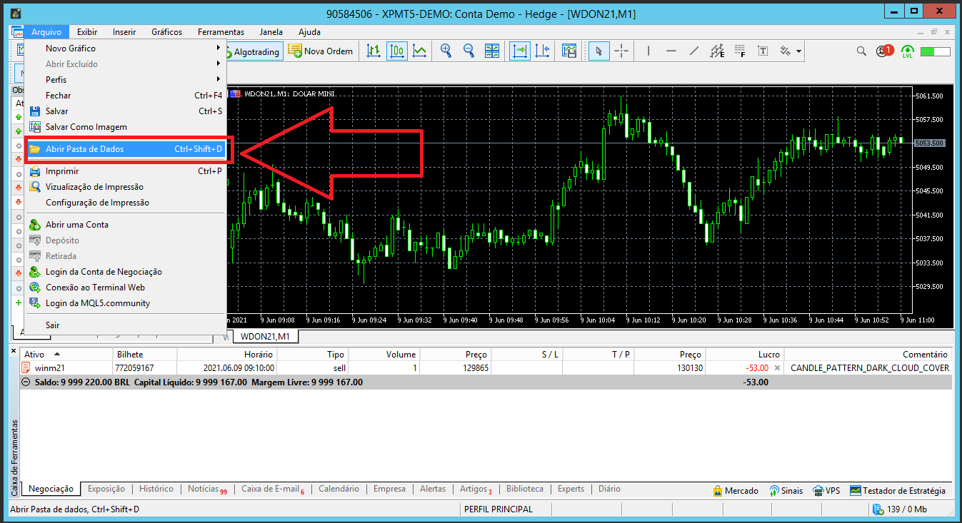 Abra a pasta de dados onde fica instalado o Expert da EAFXTRADE, para isso, clique no menu arquivo e em seguida clique em “Abrir Pasta de Dados”