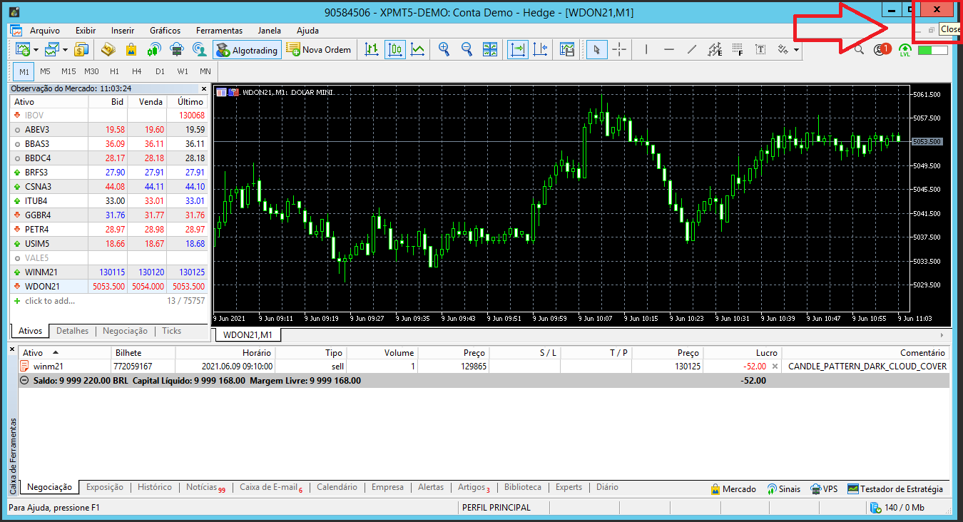 Feche o Metatrader por completo clicando no botão em destaque: