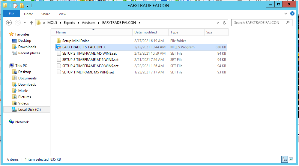 Com o Metatrader Fechado, Pegue a pasta de Dados, clique em MQL5, Clique novamente em Experts\Advisor\EAFXTRADE FALCON, e novamente clique em EAFXTRADE_TS_FALCON_X.