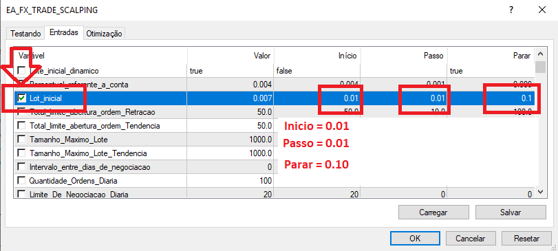 Veja que o examinador vai testar o parâmetro Lot_Inicial de 0.01 até 0.10, com o incremento de 0.01, então ele vai fazer o teste 10 vezes.